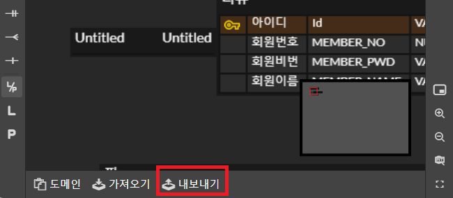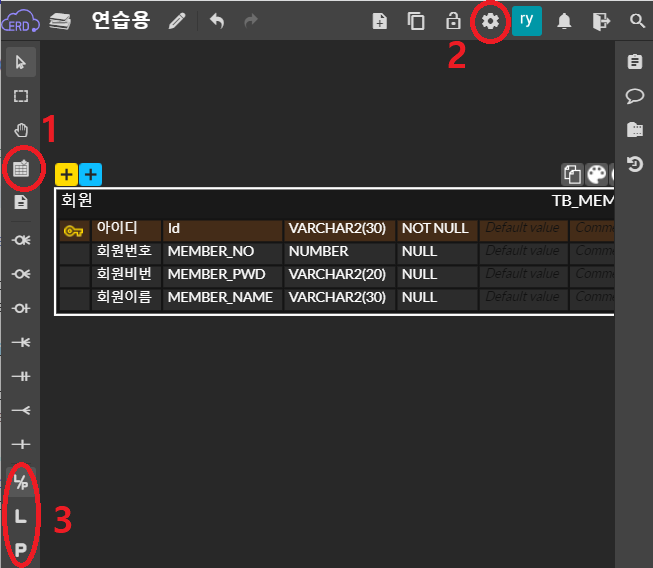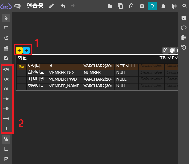 - 컬럼도 왼쪽입력란(논리)과 오른쪽입력란(물리)이 있음 - 외래키 설정하는 아이콘들.