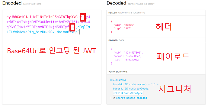 - JWT는 Header, Payload, Signature의 3 부분으로 이루어지며, Json 형태인 각 부분은 Base64Url로 인코딩 되어 표현된다. 또한 각각의 부분을 이어 주기 위해 ' . ' 구분자를 사용하여 구분한다.