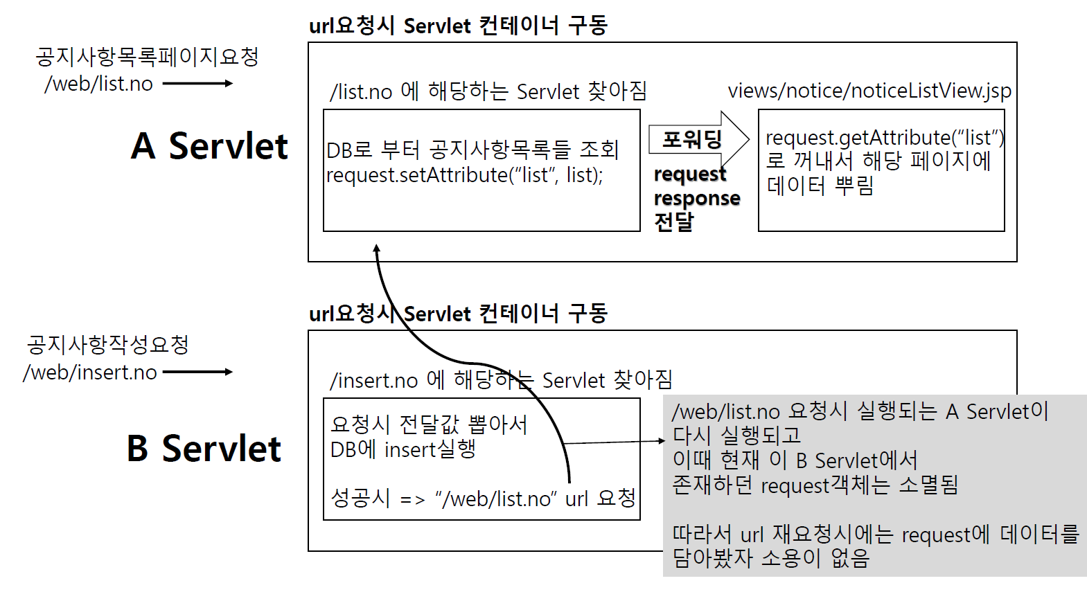 - 서버 내 포워딩을 통해 같은 요청 흐름 안에서 요청을 전달하여 url이 변경되지 않는다